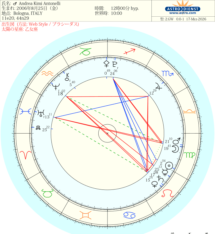 先日、開催されたF1の中国グランプリで初優勝したイタリア人ドライヴァー、アンドレア・キミ・アントネッリのホロスコープを読んでみたいと思います。